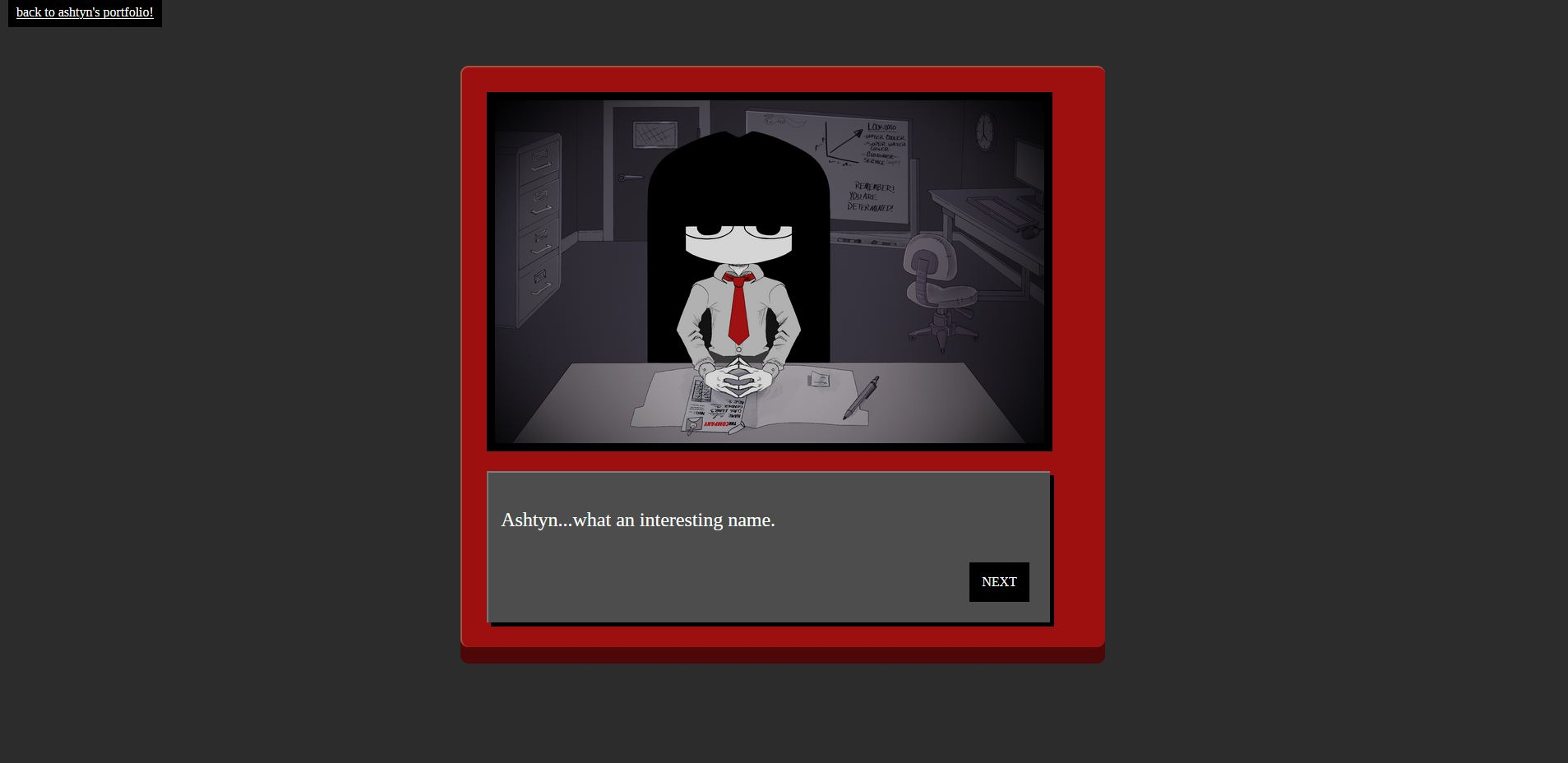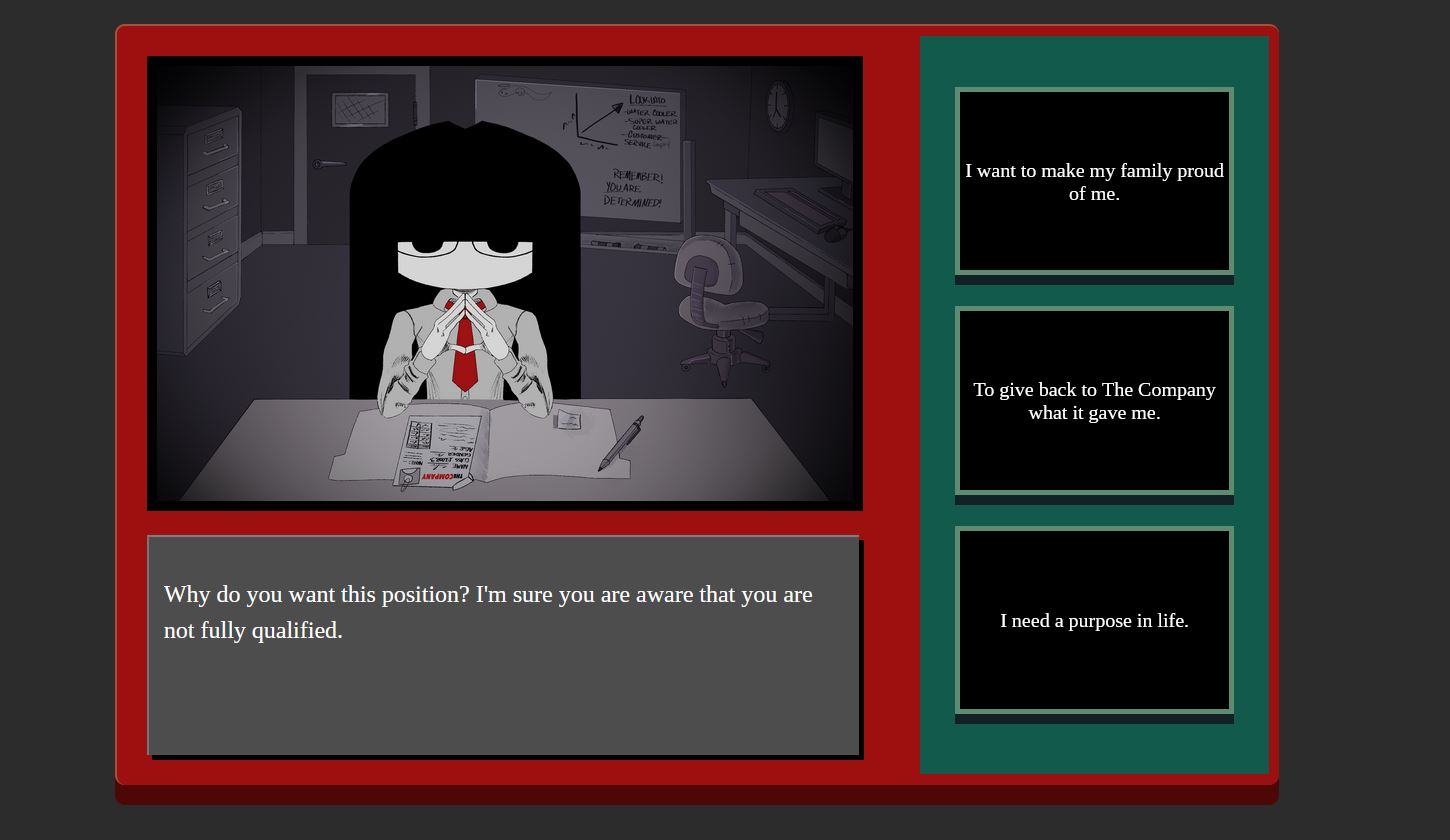 The Company is a web-based visual novel coded in HTML, CSS, and Javascript. It's a non-linear narrative about a manager interviewing you, and she seems very hard to impress! Don't worry, all of her reactions are entirely random. Every playthrough is unique! Click here to play The Company.